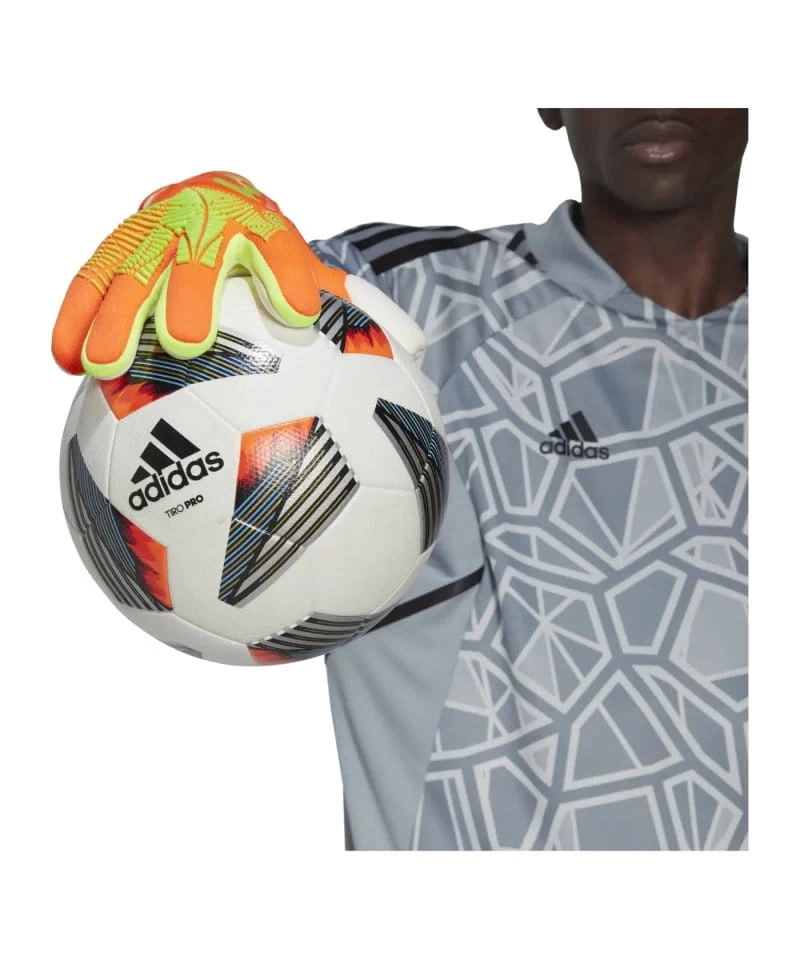 Bereit für die geballte Performance-Power? Diese adidas Predator Torwarthandschuhe kommen mit einer flexiblen, gewirkten Rückhand mit Zone Skin Silikonbeschichtung für optimale Kontrolle beim Fausten. Die hochwertige URG 2.0-Handfläche ist an der Außenseite vor Abrieb geschützt und bietet hervorragenden Grip und Dämpfung. Der Schaft ohne Handgelenksbandage sorgt für eine bequeme und natürliche Passform.