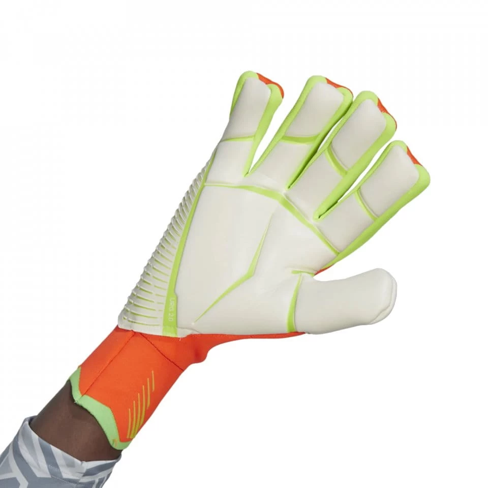 Bereit für die geballte Performance-Power? Diese adidas Predator Torwarthandschuhe kommen mit einer Zone Skin Rückhand mit Silikonbeschichtung für optimale Kontrolle beim Fausten. Außerdem sorgen die Fingersave Elemente beim Werfen und Abwehren von harten Schüssen für ein Plus an Support. Die hochwertige URG 2.0-Handfläche ist an der Außenseite vor Abrieb geschützt und bietet hervorragenden Grip und Dämpfung. Der Schaft ohne Handgelenksbandage sorgt für eine bequeme und natürliche Passform.